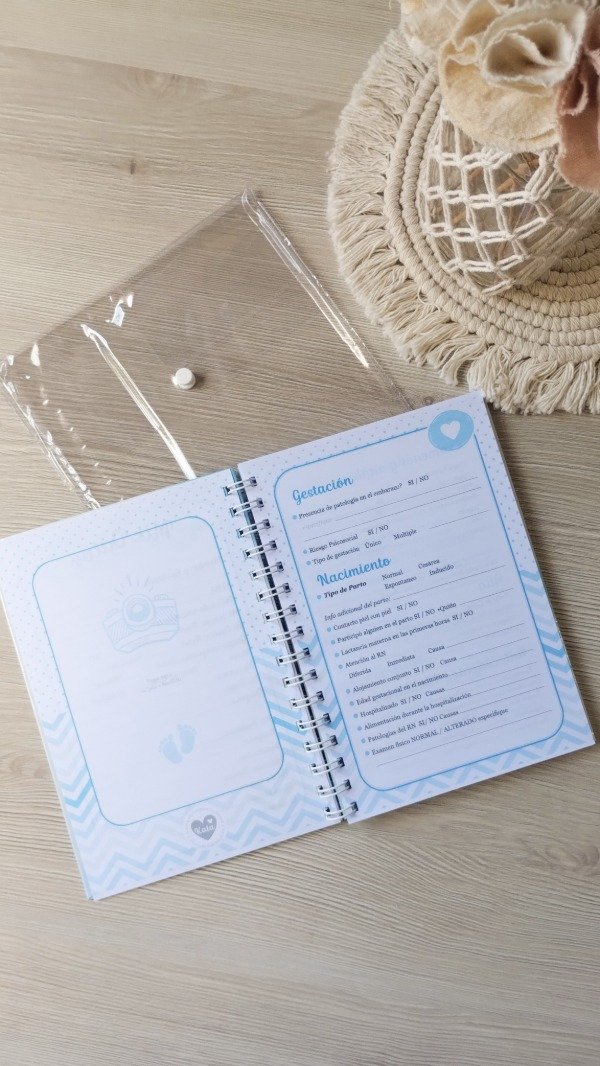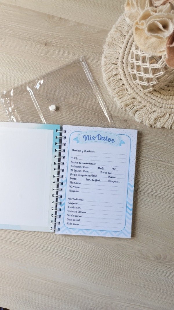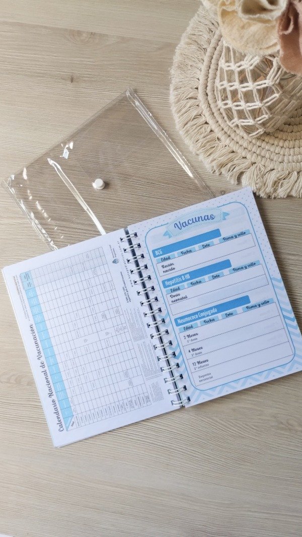 Se entrega con un Sobre de PVC con cierre de boton, para proteger el cuaderno, guardar recetas y papeles importantes del bebé.